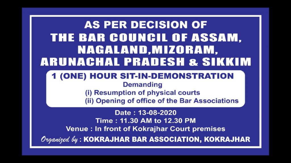 The Bar Council of Assam, Nagaland, Mizoram, Arunachal Pradesh, & Sikkim had adopted a resolution in the meeting held on 10/08/2020 to sit in demonstration in every Bar Association in N.E. Region under the Bar Council on, 13/08/2020 for resumption of physical court and opening of offices of Bar Associations under Gauhati High Court, Assam.